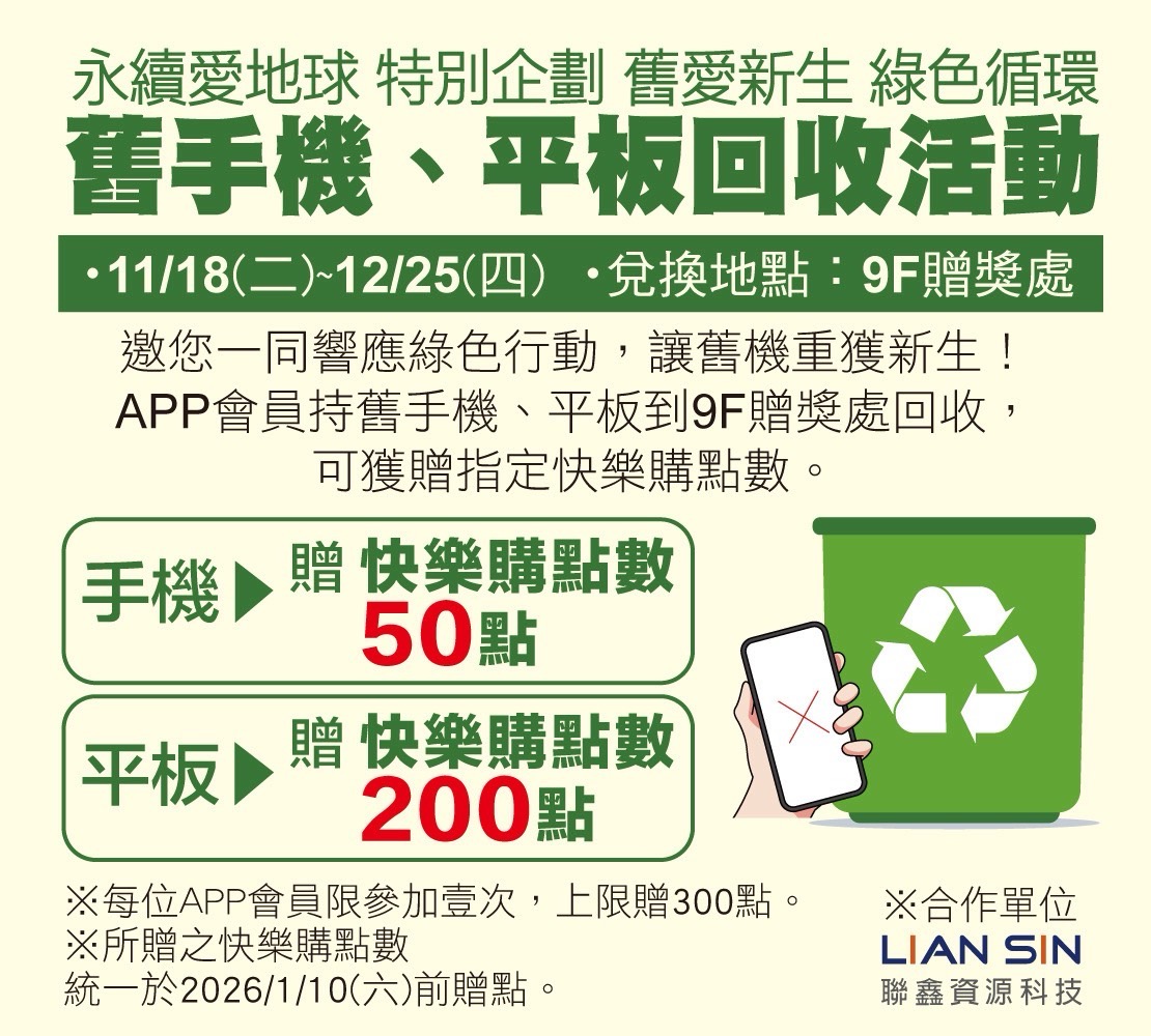 本次回收活動由聯鑫資源科技提供完整且合法的電子廢棄物回收服務,負責後端的專業處理流程;SOGO百貨則發揮其通路與會員體系優勢,於百貨據點設置回收點,並以消費點數回饋鼓勵民眾參與。